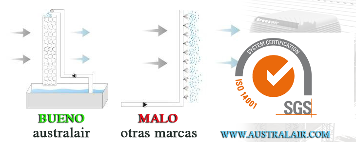 Según la Guia Técnica del Ministerio de Sanidad para prevención y control de la Legionellosis en instalaciones nos habla de los enfriadores evaporativos como equipos que no estan diseñados para producir pulverización de agua e ningún punto del sistema, y por tanto el riesgo de transmisión de Legionella es practicamente nulo. Las temperaturas que suele alcanzar el agua son normalmente bajas, las propias del agua de red. No se suele producir un calentamiento excesivo, ya que la renovación de la balsa suele ser elevada, excepto en casos en los que el equipo haya estado parado durante un periodo de tiempo elevado y especialmente si se encuentra directamente expuesto al sol. Es innegable por otra parte, que estos equipos ponen en contacto una superficie húmeda con la corriente de aire introducida directamente en los espacios interiores, y por lo tanto, deben ser equipos sometidos a un mantenimiento muy estricto por la posible proliferación de hongos o bacterias,pero es improbable que se convierta en un foco de transmisión de Legionella